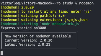 - 터미널에 node 파일명 대신에 nodemon 이라고 쓰면 서버가 저장될 때마다 재실행되며 지속된다. 개꿀이다. (단, package.json에 main 파일명을 잘 입력해야 한다. 여기서는 meadowlark.js 라고 입력했다.)