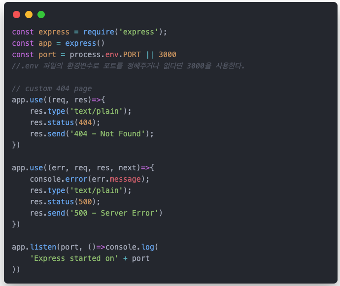 - app.use는 미들웨어와 관련된 메서드이다. 지금은 일단 라우터가 일치하지 않을 경우 사용할 일종의 폴백 핸들러라고 생각해도 된다.
