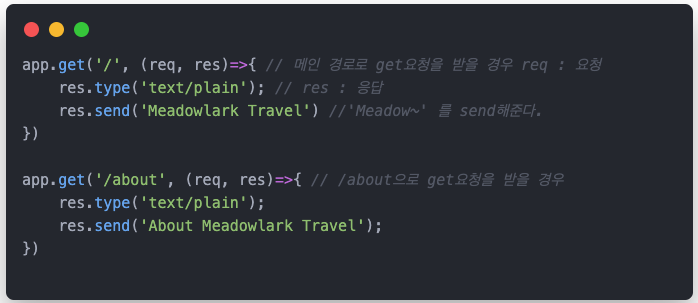 - 함수는 라우트가 일치할 경우 호출할 함수이다. req와 res (요청과 응답) 객체가 매개변수로 전달되는데, 이는 나중에 자세히 다룬다.