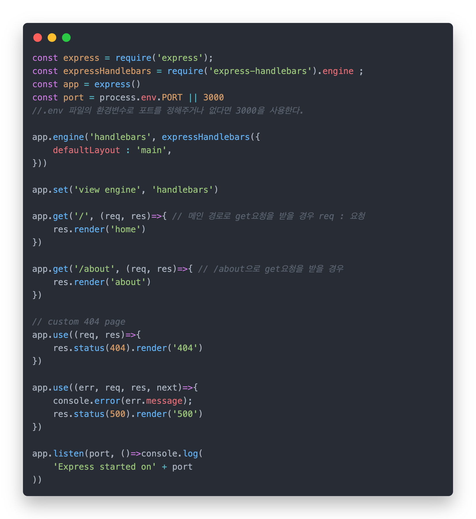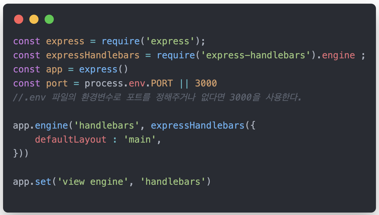- 저번 시간에 npm i express-handlebars 설치를 통해 모듈을 설치했으면 다음과 같이 코드를 추가해준다.