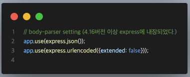 - 보통 미들웨어에 바디파서 세팅을 통해 req.body 객체에 데이터를 추가해주는 역할을 한다.