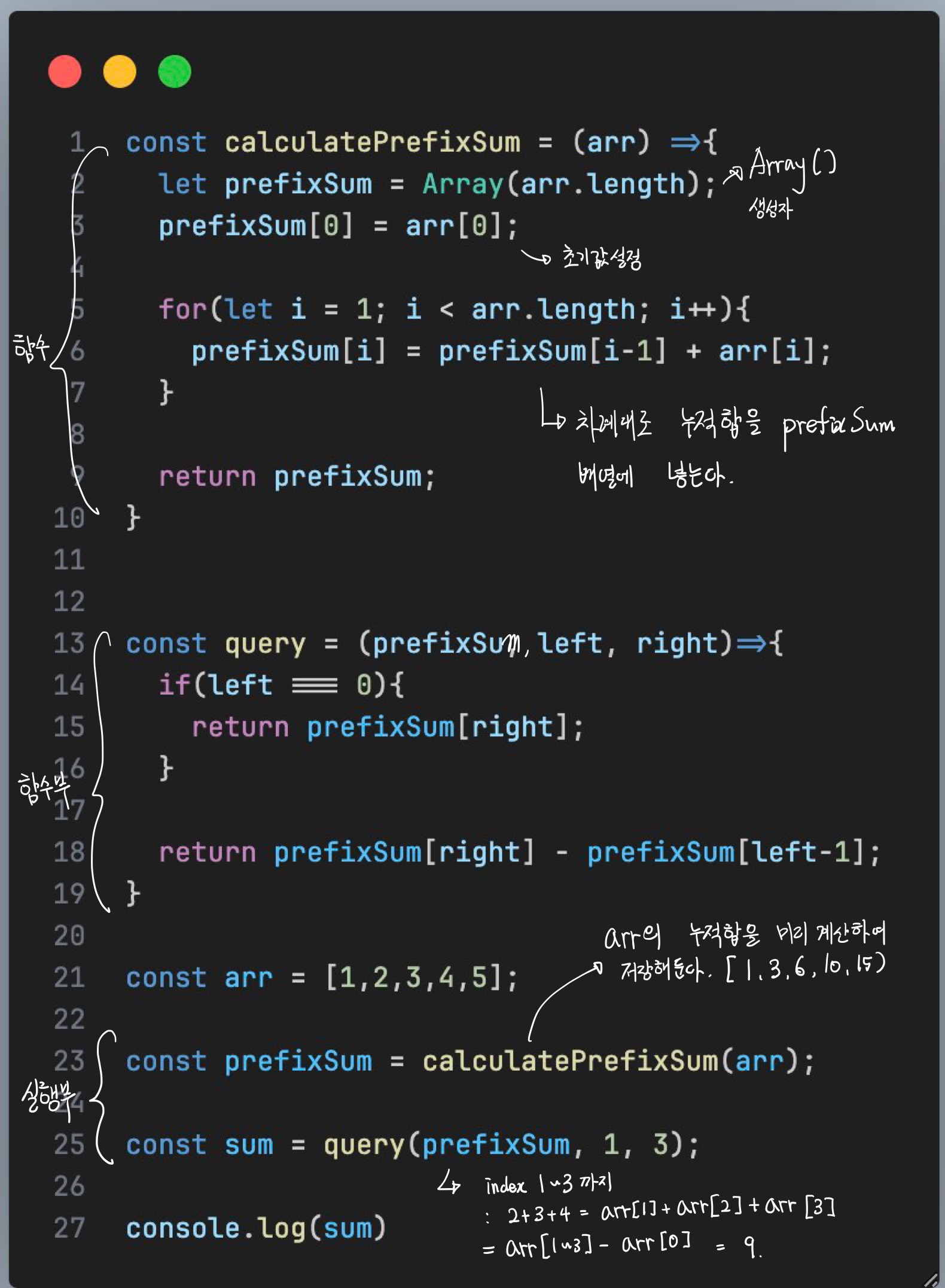 - 배열에서 연속된 부분의 합을 미리 계산하고 저장하여, 이후에 필요한 구간합을 빠르게 계산할 수 있다.