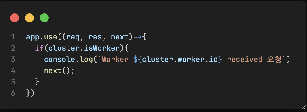 - 다음 미들웨어를 라우트 앞단에 두어 각 요청마다 다른 워커가 요청을 처리하는 것을 확인할 수 있다.