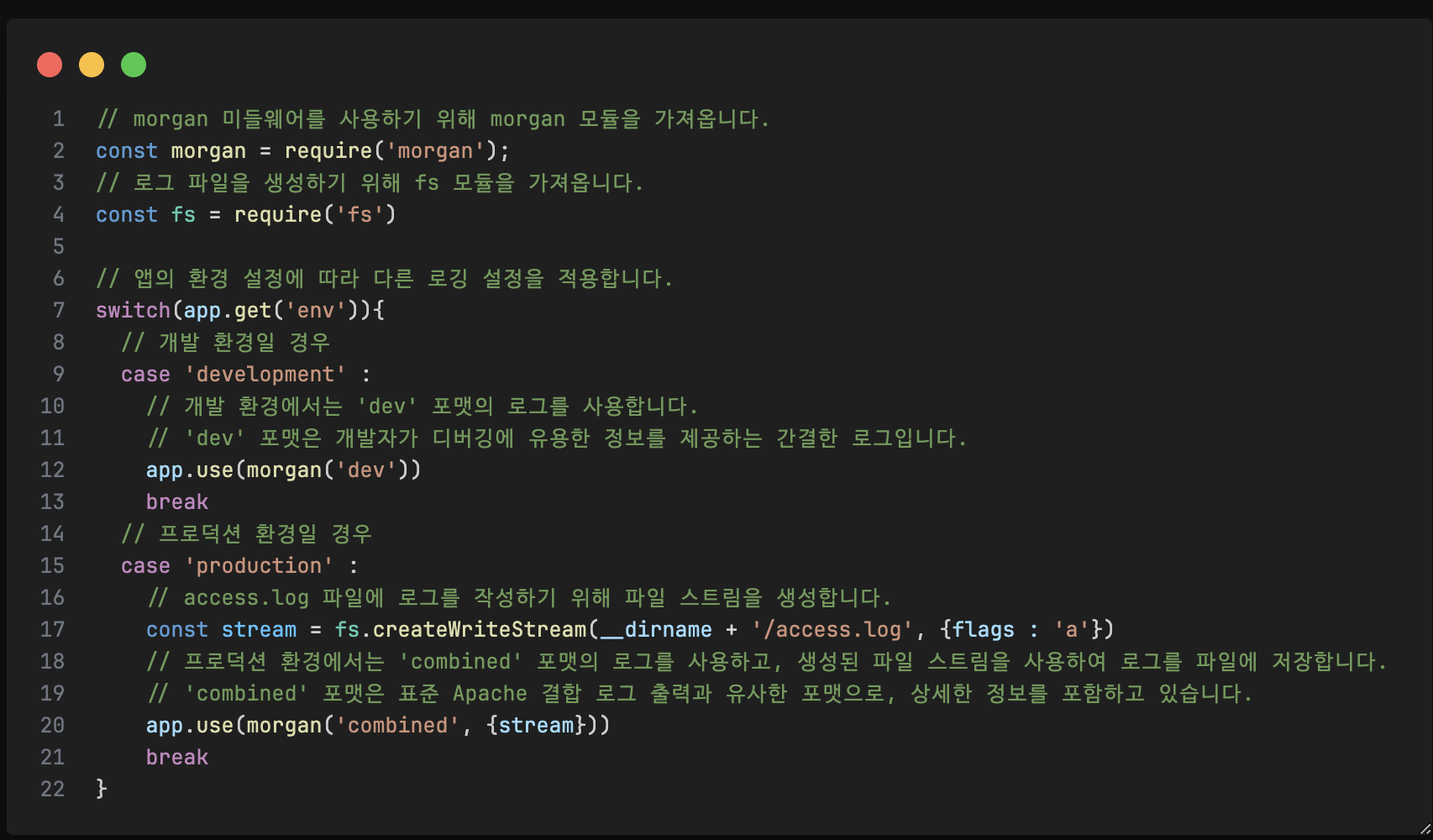 - NODE_ENV를 production으로 설정하면 터미널에는 기록되지 않지만, 활동 내용이 아파치의로그 형식으로 저장된다.