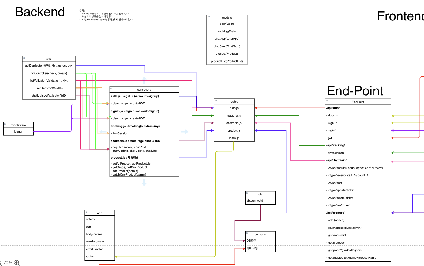 - 엔드포인트의 역할과 연결구성은 별도의 gitMind 파일로 구조화하고, 디렉토리 구조를 기반으로 모듈화 해서 연결한다면 내가 봐야할 코드가 어디에 있는지 확실하게 알기 때문에 찾아가서 보기만 하면 된다.