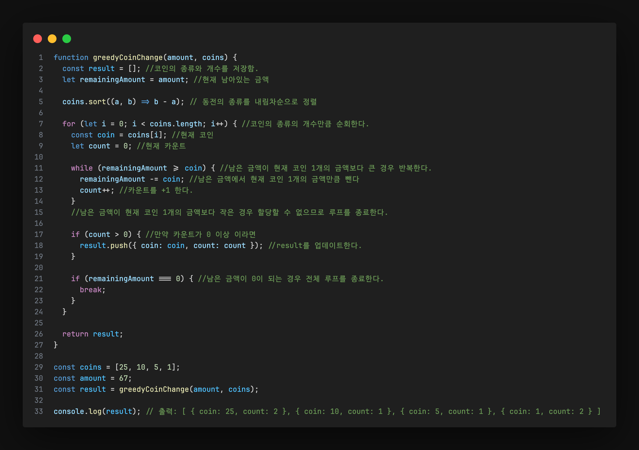 - 주어진 금액에서 동전의 개수를 최소로 하려면 가장 금액이 큰 동전부터 차례대로 남은금액에 최대한 개수를 채우면 된다.