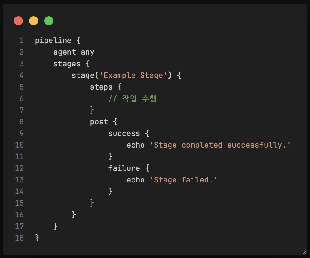 - post 블록은 파이프라인이나 스테이지가 완료된 후에 실행할 작업을 정의한다. 다양한 상태에 따라 다른 작업을 수행할 수 있다.