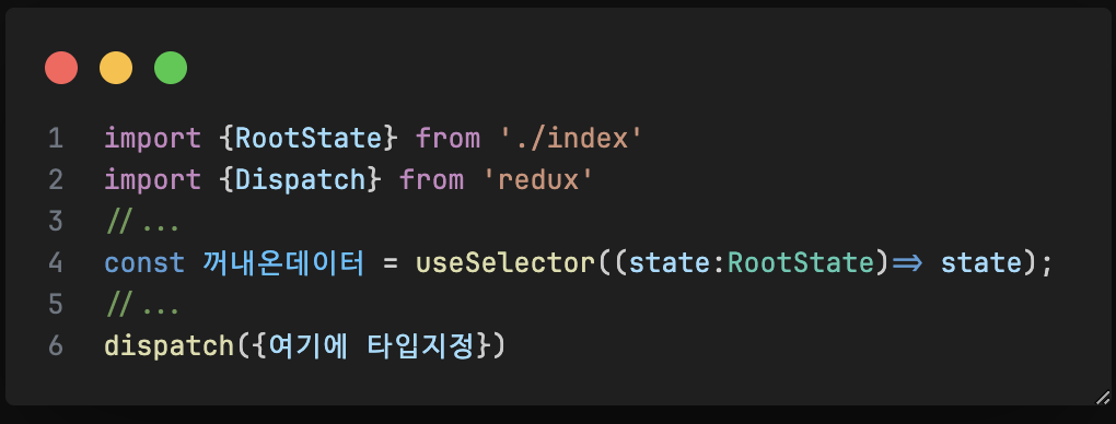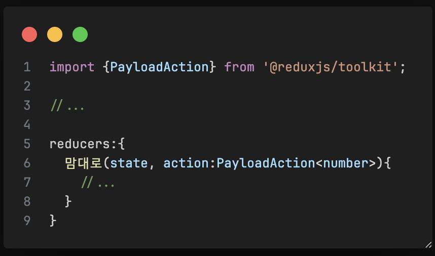 - redux-toolkit에서는 PayloadAction 을 import 해와서 사용해야한다.