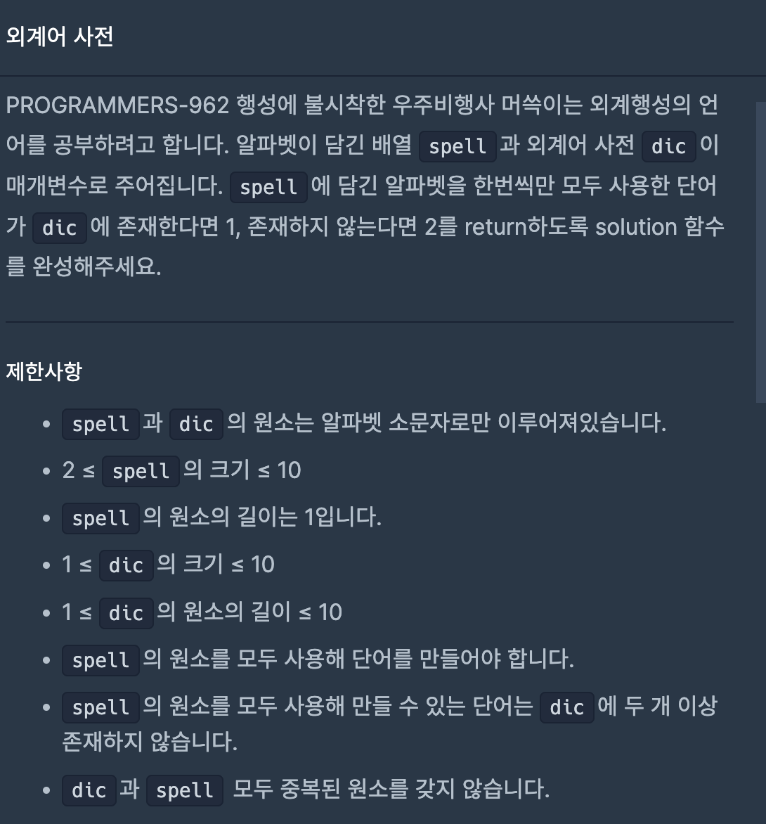 //중복되지 않으며, spell의 원소 모두를 사용해야하므로 dic의 요소 중에서 spell의 전체의 길이와