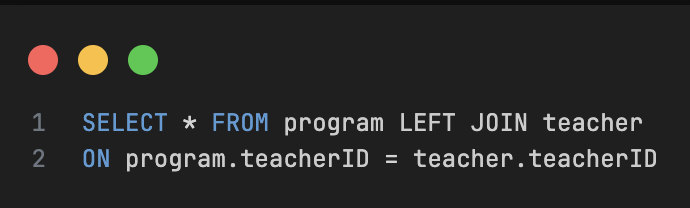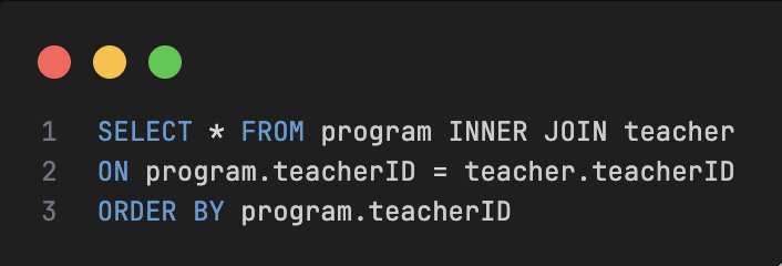 - SELECT * FROM program, teacher WHERE program.teacherID = teacher.teacherID ORDER BY program.teacherID