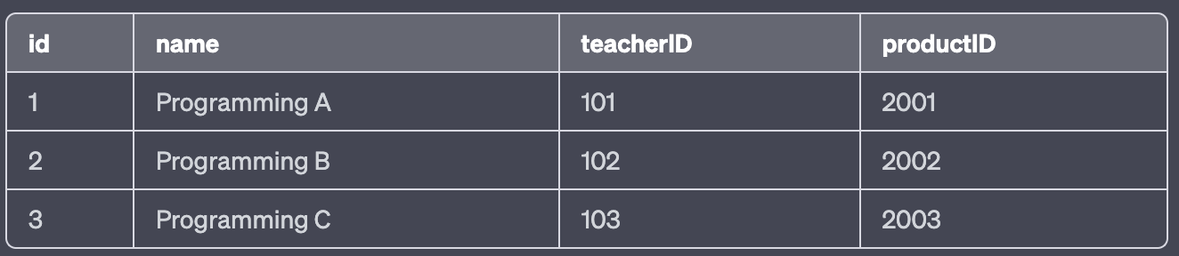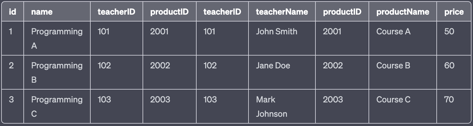- teacherID와 productID가 중복되는 것을 볼 수 있는데, 중복을 제거하려면 * 대신에 필요한 열만 선택해서 가져오면 된다.