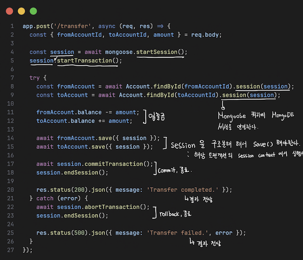 - Express/Mongoose 에서는 Mongoose의 session 메서드를 이용한다.