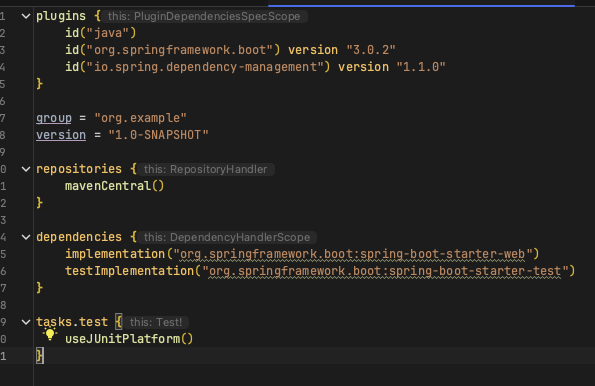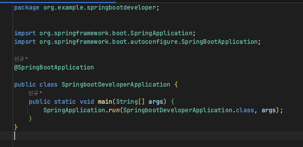 - 디렉터리를 세팅한다. SpringbootDeveloperApplication.java 는 main 클래스가 있는 곳이다.