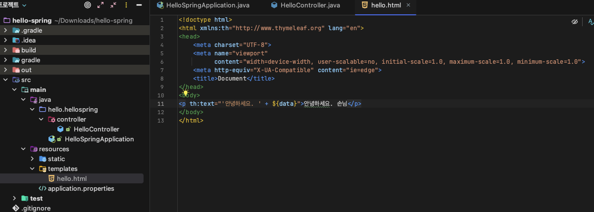 - 기본적으로 Spring은 return값("hello")을 templates 밑에서 찾는다 (resources:templates/hello.html을 찾는다.)
