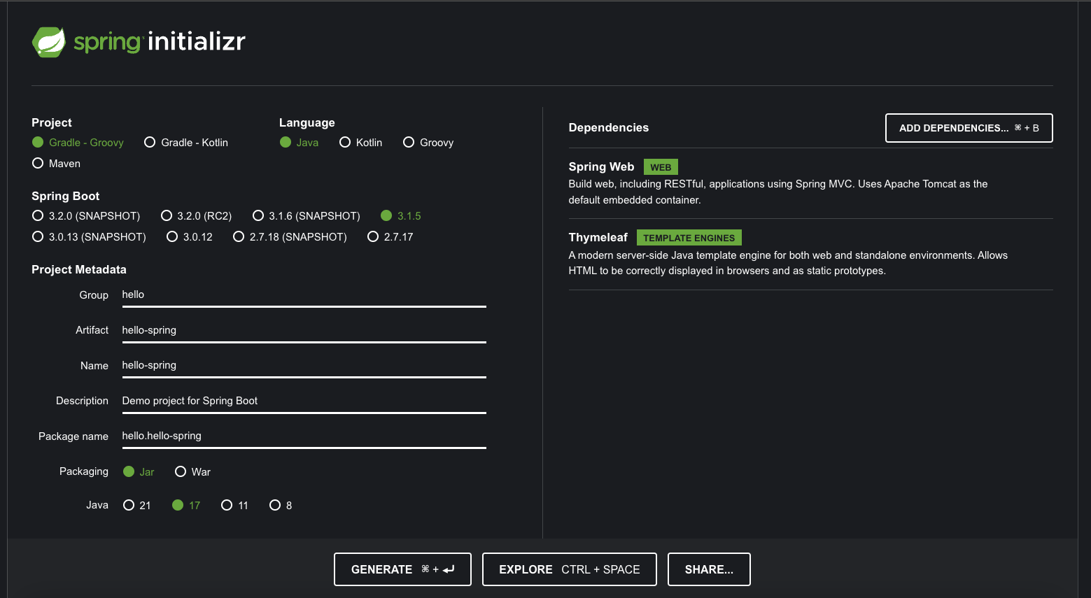 - Dependency : Spring Web, Thymeleaf(템플릿 엔진)
