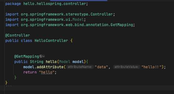 - model.addAttribute는 ("data"의 값을 "hello!!"로 치환한다)