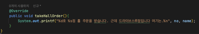 - super : 생성자 안에서 사용되지 않는 경우 부모 그 자체를 가리킨다. super.takeHallOrder() 처럼 사용이 가능하다.