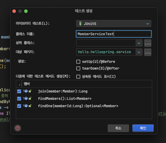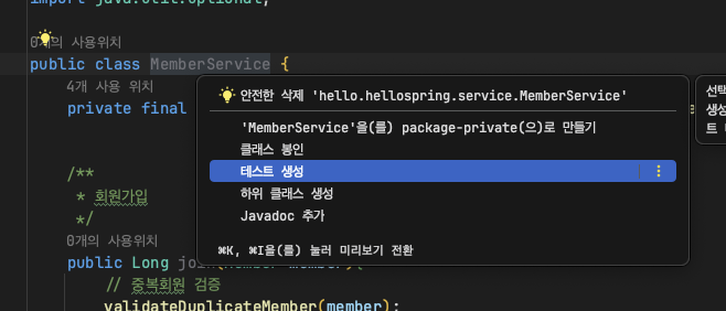 - 클래스에서 커맨드 + . 누르고 테스트 생성을 통해 편하게 생성할 수 있다.