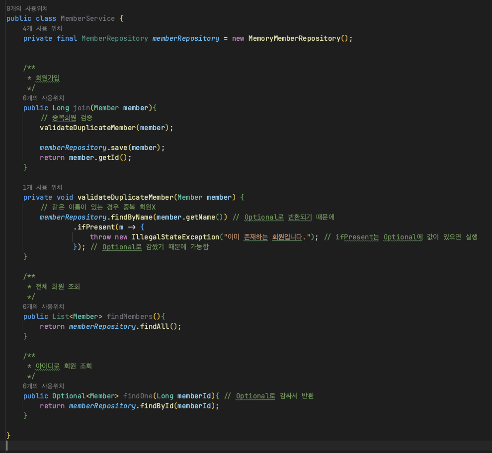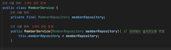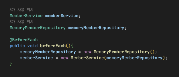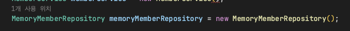 - 근데 이런 경우 테스트케이스에서 사용하는 아래의 코드가 MemberService에서 사용하는 리포지토리와 다른 인스턴스가 되므로
