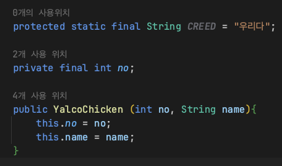 - 클래스 내에서 final로 필드를 선언할 경우 생성자에서 반드시 초기화 해주어야 한다.
