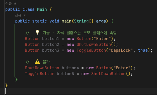 - 자식 인스턴스는 부모형 클래스를 따를 수 있으나 부모는 자식형을 따를 수 없다. 형제도 안됨.