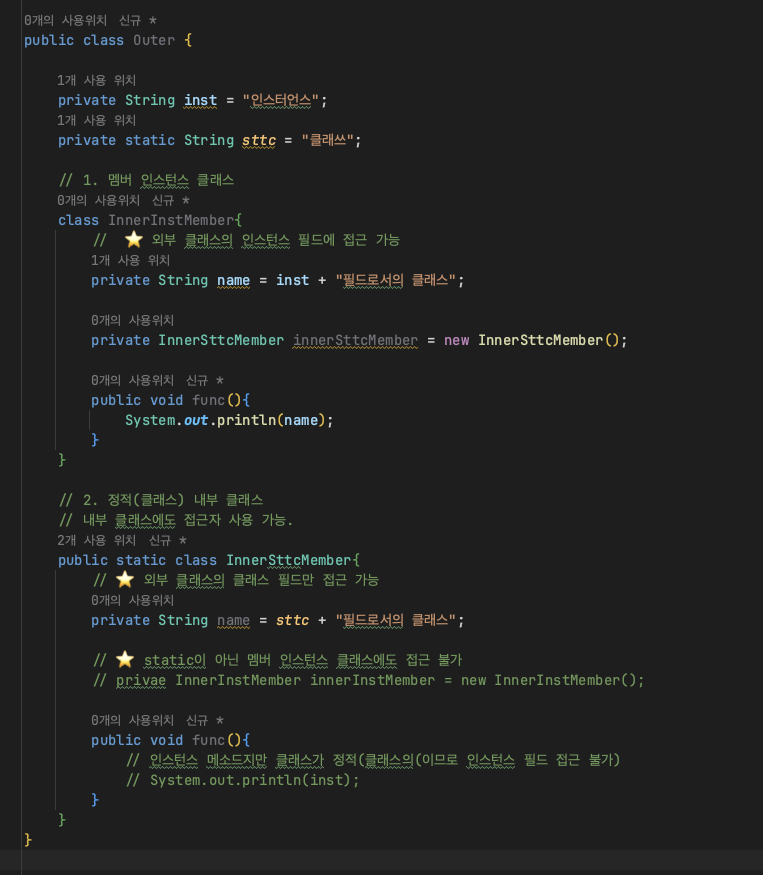 - 멤머 인스턴스 , 정적 내부 클래스 , 메소드 안에 정의된 클래스 , 익명클래스 가 있다.