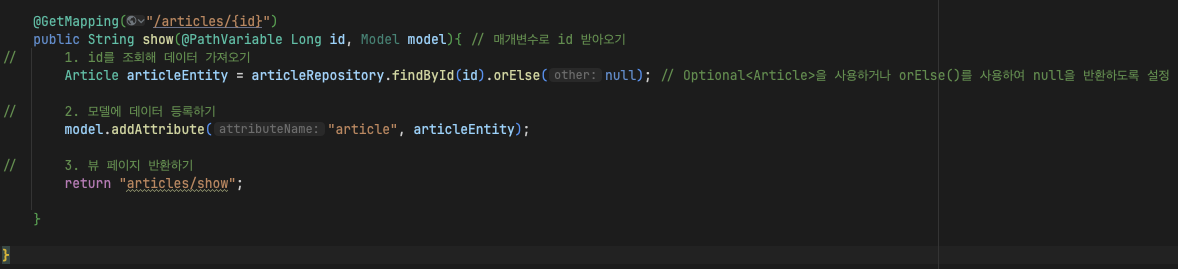 1. 순서 : Get요청 -> 서버의 컨트롤러 -> Repository에 전달 -> DB에 데이터 조회 -> DB는 찾아서 Entity로 반환 -> 반환된 Entity는 Model을 통해 뷰템플릿으로 전달 -> 뷰 페이지 완성