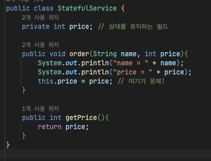 - 싱글톤 빈의 필드에 공유 값을 설정하면 큰 장애가 발생할 수 있다.