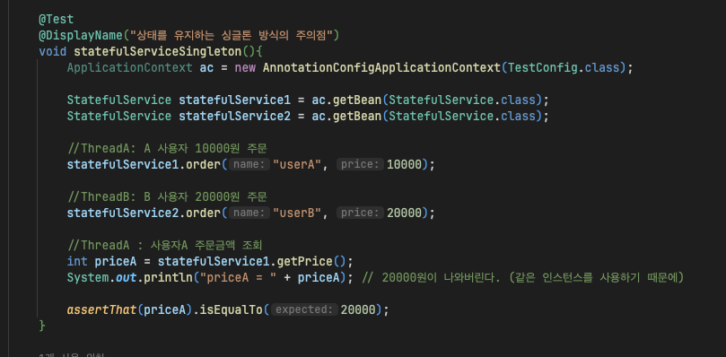 : 싱글톤방식은 여러 클라이언트가 같은 객체인스턴스를 공유하므로, 싱글톤 객체는 상태를 stateful(유지) 하게 설계하면 안된다.