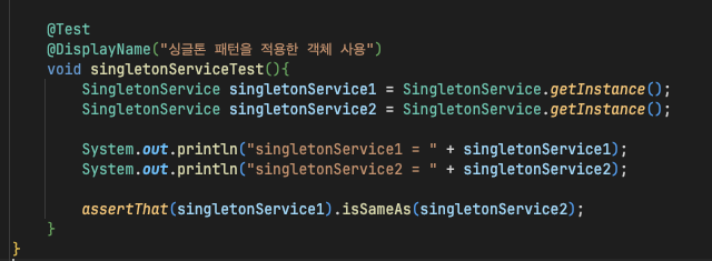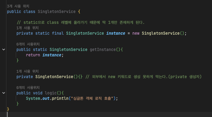 - 싱글톤은 클래스 인스턴스가 딱 1개만 생성되도록 보장하는 패턴이다.