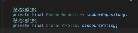 - 불변성, 필수 의존관계에서 사용된다. (memberRepository, discountPolicy가 안바뀌게 함, final 붙이는 것도)