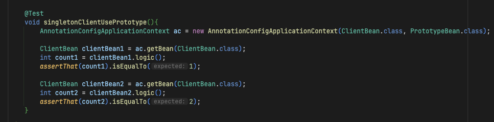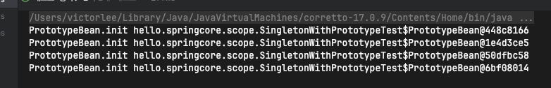 - 여기서는 ClientBean(싱글톤 빈)의 생성시점에 프로토타입빈이 주입된다. 그러고 관리가 끝난다.