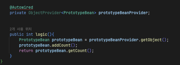 - logic() 메서드에서 ac.getBean(PrototypeBean.class); 해서 가져오는것도 가능함 (프로토타입을 사용할 때마다 스프링컨테이너에 요청) -> Dependency Lookup(의존관계 조회) 라고 한다.