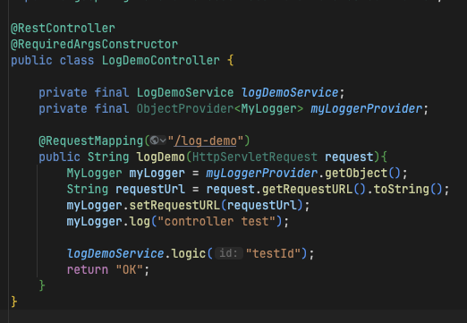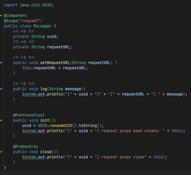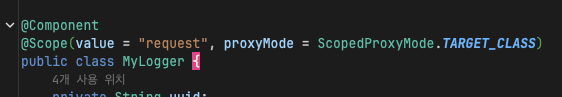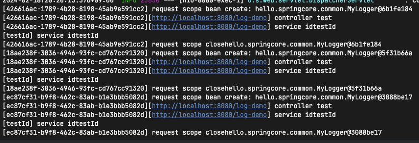 - MyLogger는 각각 다른 인스턴스로 생성, 앞의 uuid 또한 http 요청에 따라 다르게 잘 생성되었다.