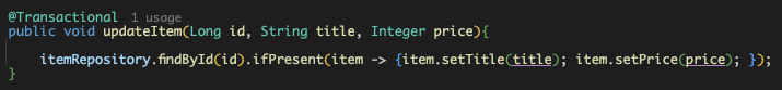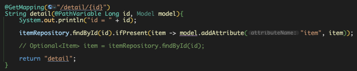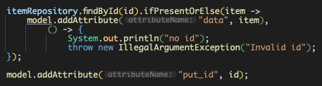 - .ifPresentOrElse(item -> 있으면 할거, () -> 없으면 할거)