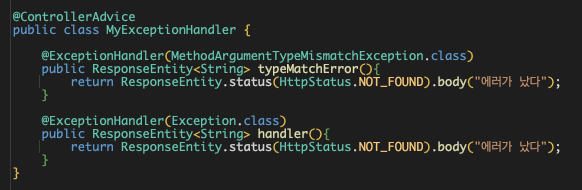 - 여기서는 MyExceptionHandler class를 만들어서 여기서 함