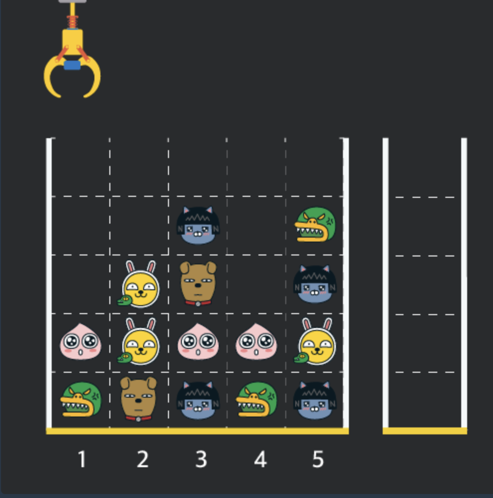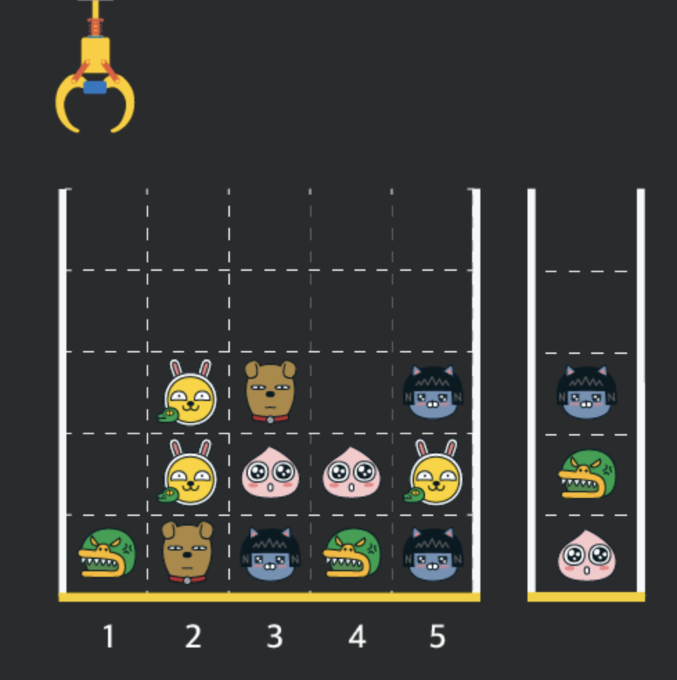게임 화면은 "1 x 1" 크기의 칸들로 이루어진 "N x N" 크기의 정사각 격자이며 위쪽에는 크레인이 있고 오른쪽에는 바구니가 있습니다. (위 그림은 "5 x 5" 크기의 예시입니다). 각 격자 칸에는 다양한 인형이 들어 있으며 인형이 없는 칸은 빈칸입니다. 모든 인형은 "1 x 1" 크기의 격자 한 칸을 차지하며 격자의 가장 아래 칸부터 차곡차곡 쌓여 있습니다. 게임 사용자는 크레인을 좌우로 움직여서 멈춘 위치에서 가장 위에 있는 인형을 집어 올릴 수 있습니다. 집어 올린 인형은 바구니에 쌓이게 되는 데, 이때 바구니의 가장 아래 칸부터 인형이 순서대로 쌓이게 됩니다. 다음 그림은 [1번, 5번, 3번] 위치에서 순서대로 인형을 집어 올려 바구니에 담은 모습입니다.