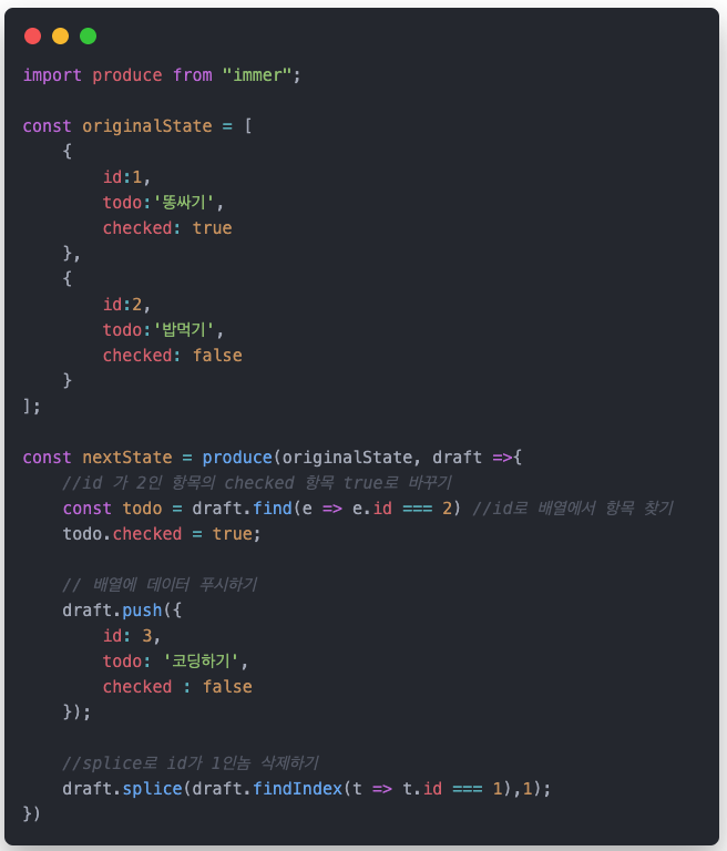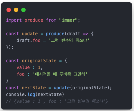 - 두번 째 파라미터 함수 내부에서 원하는 값을 변경하면, produce함수가 불변성 유지를 대신 해주면서 새로운 상태를 생성한다.