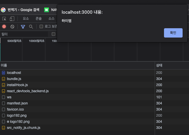 - 하이욤 버튼을 누르면 하이염이 alert로 뜨게 해놨다.